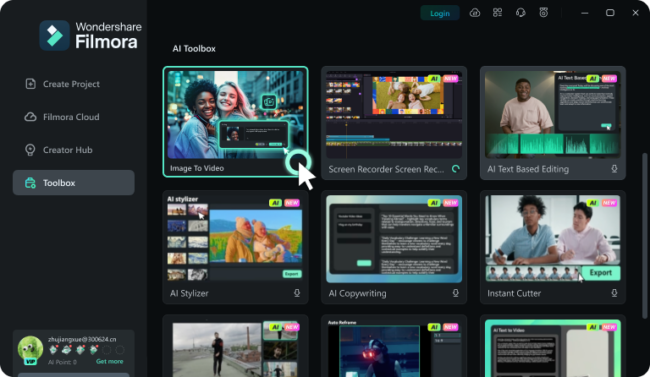 Access the feature: Open Filmora and select “Image to Video” from the startup window or Toolbox menu.