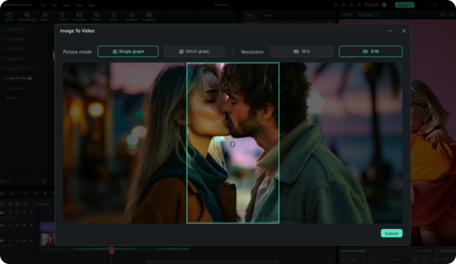 Generate the video: Pick your aspect ratio and picture mode, then click “Submit” to create your animated kiss video instantly.