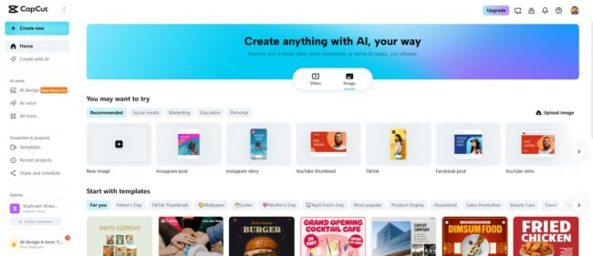 Step 1: Launch a New Pattern Project Open CapCut online image editor and go to the “Image” tab. Click on the “New image” tab to start designing vibrant pattern designs.