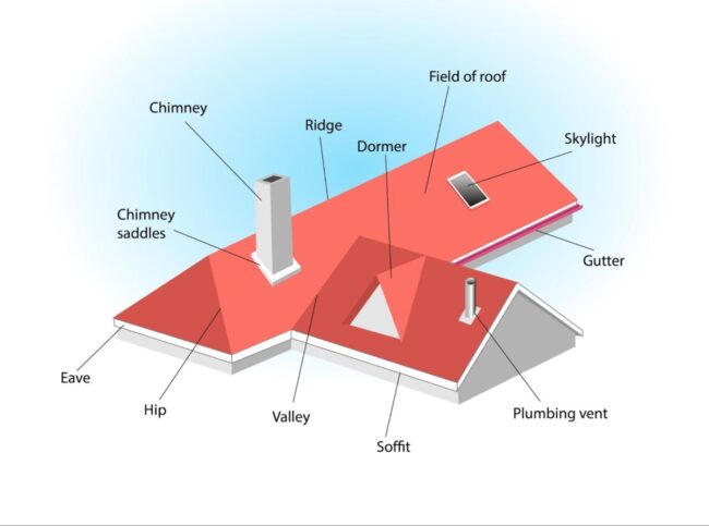 Protrusions through the roof require specialised attention. Chimneys, for instance, need a combination of step flashing and counter-flashing to ensure water is directed away from the masonry.